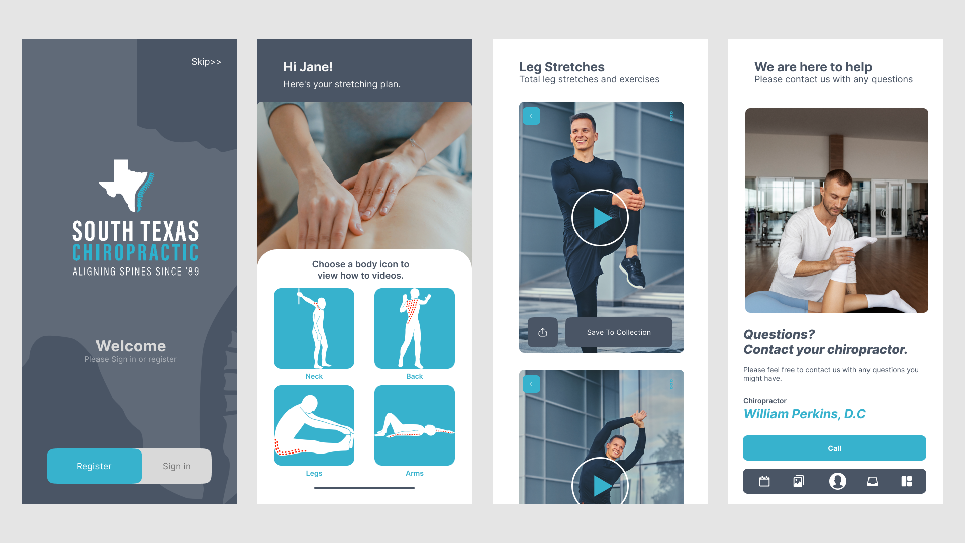 Logo creation branding was established. Doctors wanted an app to provide clients their recommendations for stretching exercises tailored to the customers specific needs. Once the customer logs in or creates an account they are able to view their recommendations from their chiropractor and contact the office with any questions. Doctor will review results on the follow up appointment which can be set up via app.