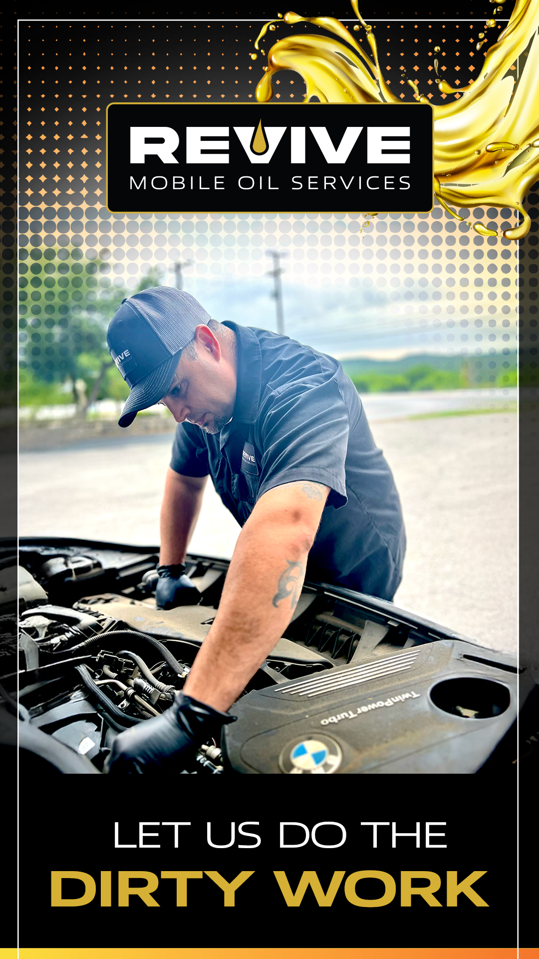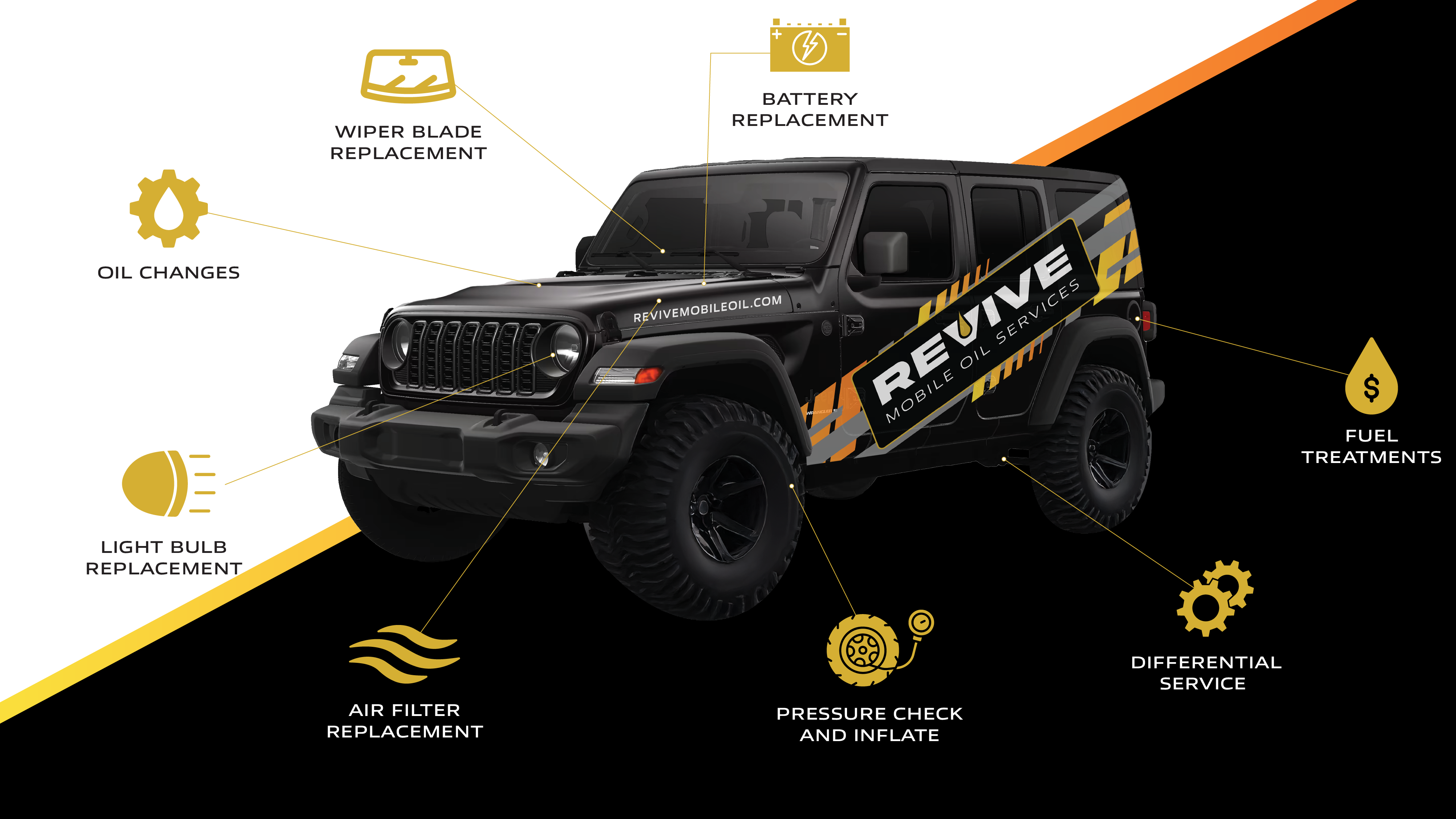 Branded vehicle graphic showcasing the services offered by Revive Mobile Oil Services.