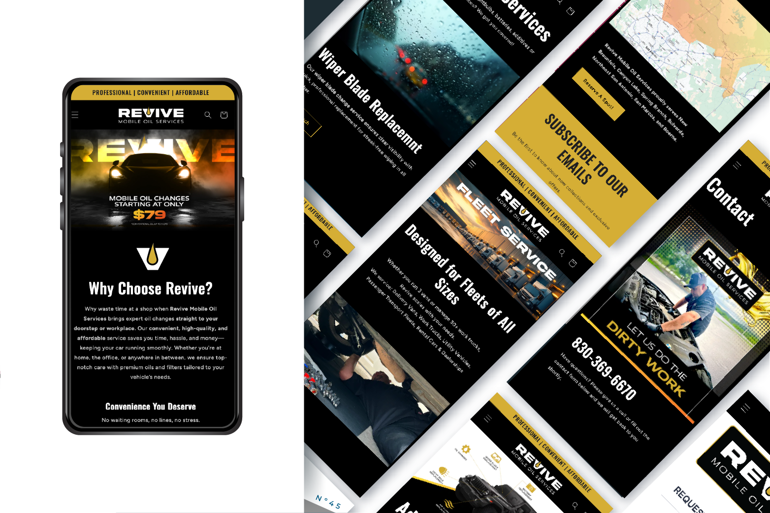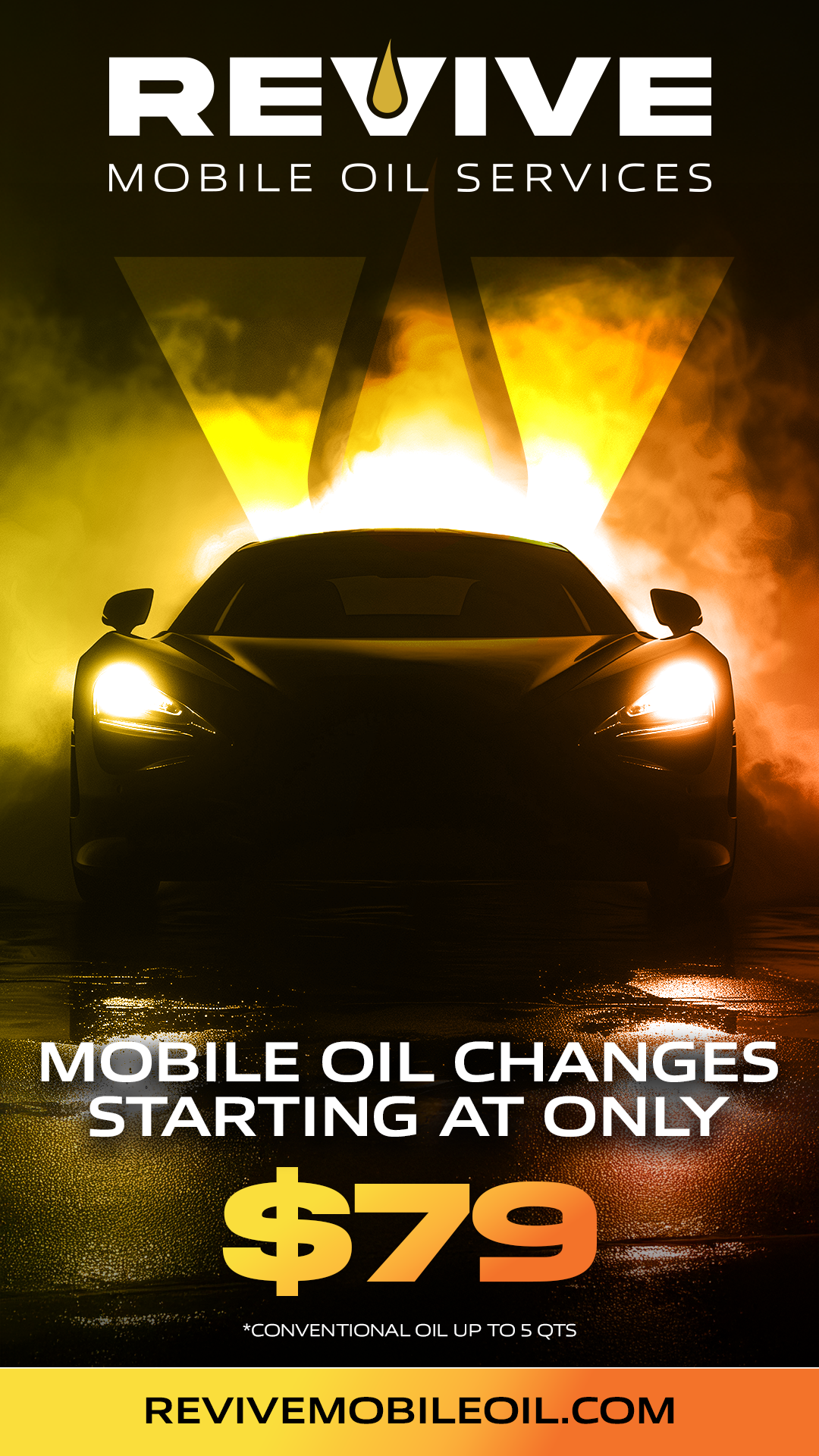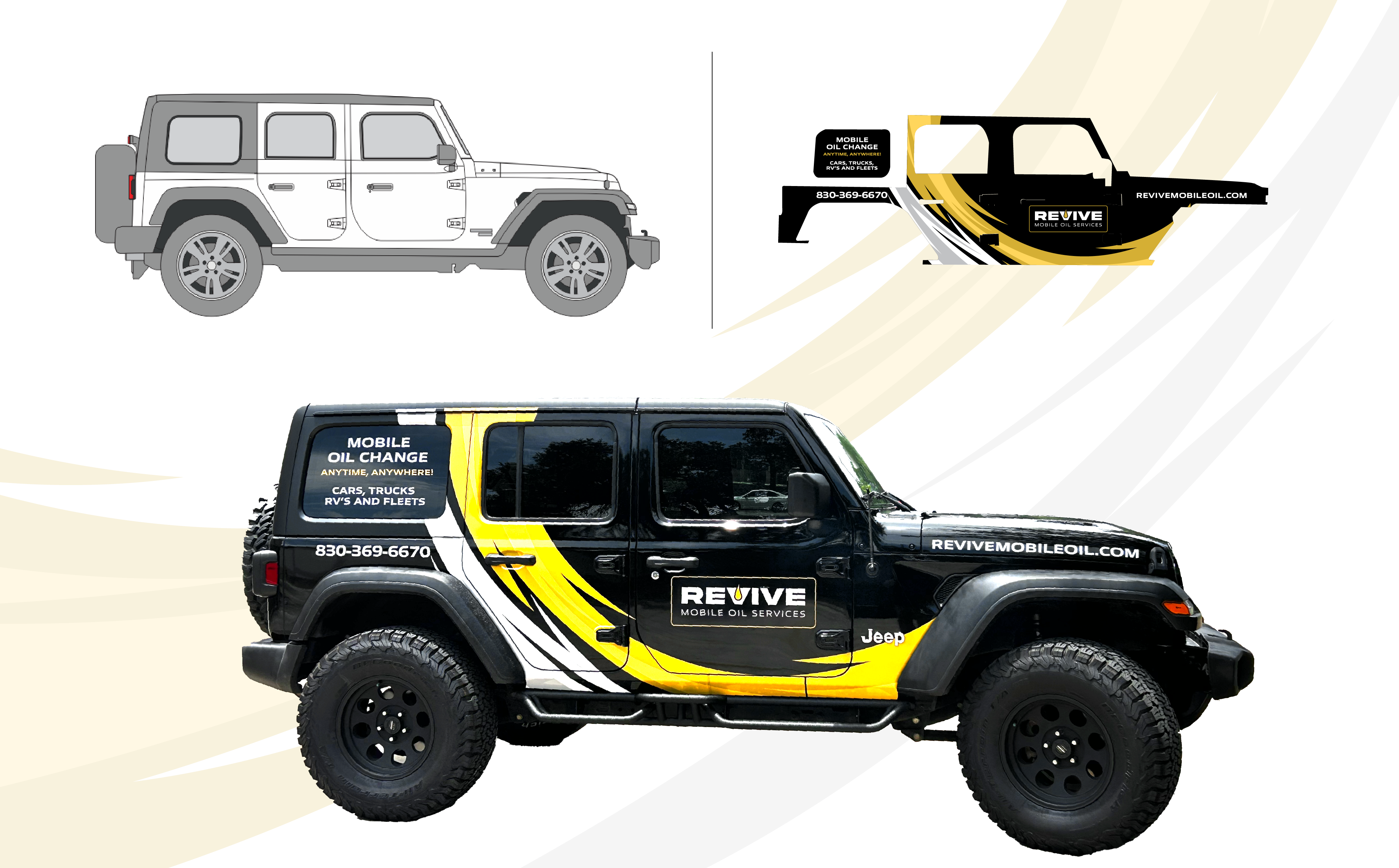 Dynamic branded vehicle wrap showcasing Revive’s Mobile Oil Service with high visibility.